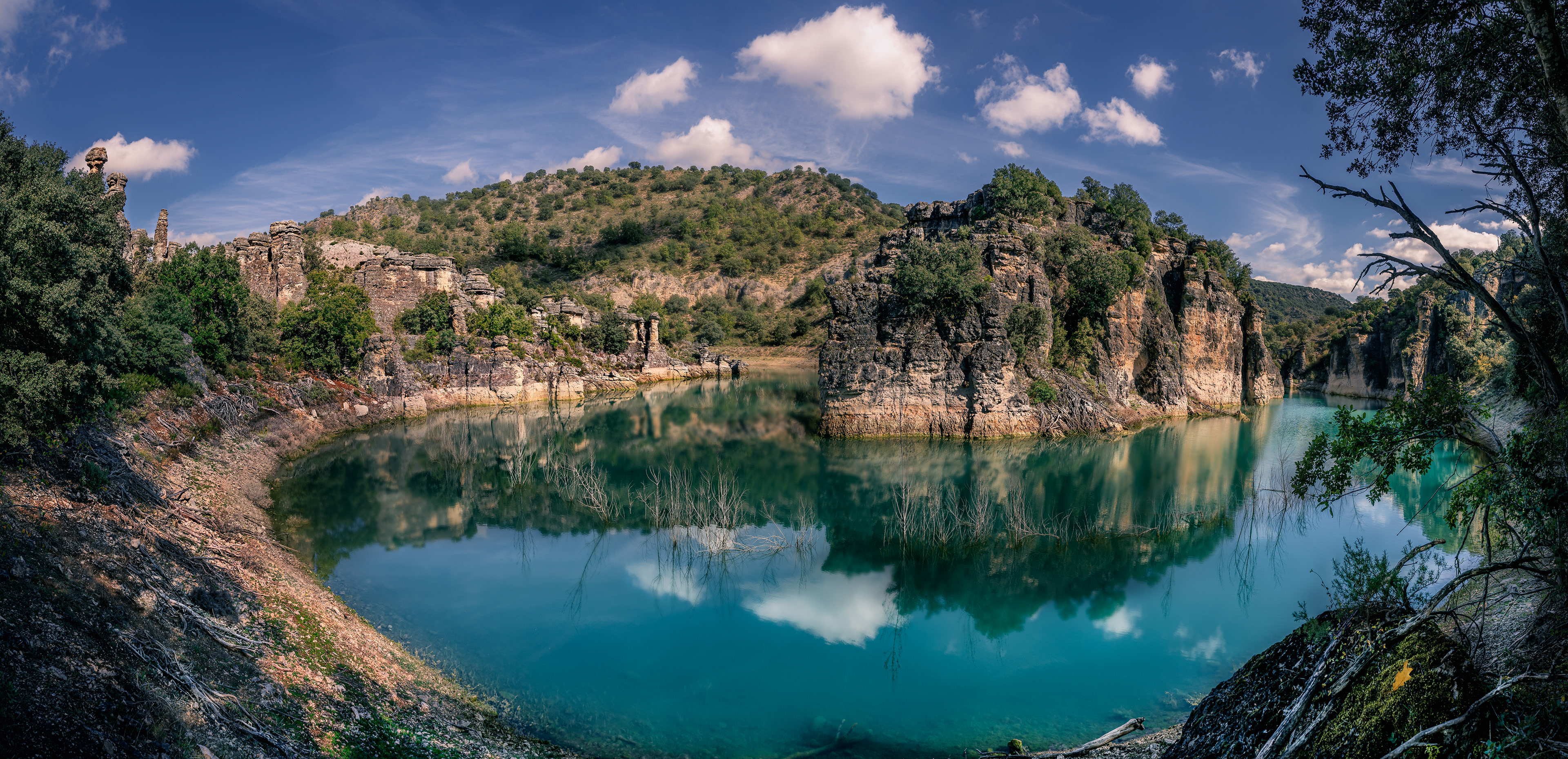 embalse de la tajera, hermosas aguas turquesas sobre las rocas calizas que forman las curiosas formaciones rocosas llamadas